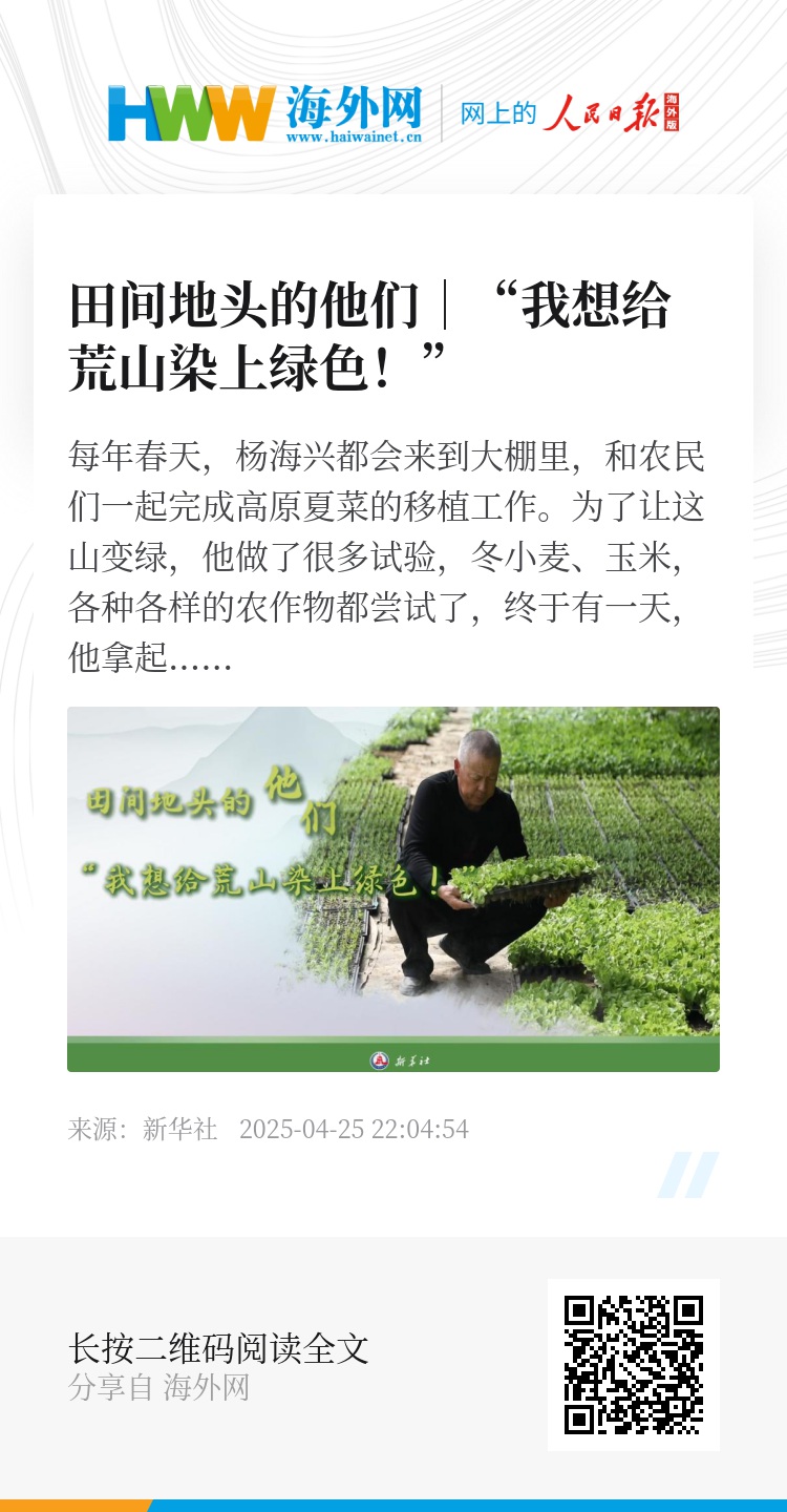 为了让这山变绿,他做了很多试验,冬小麦、玉米,各种各样的农作物都尝试了,终于有一天,他拿起了一把高原夏菜的种子,拿起了给荒山刷绿的“第一桶漆”。