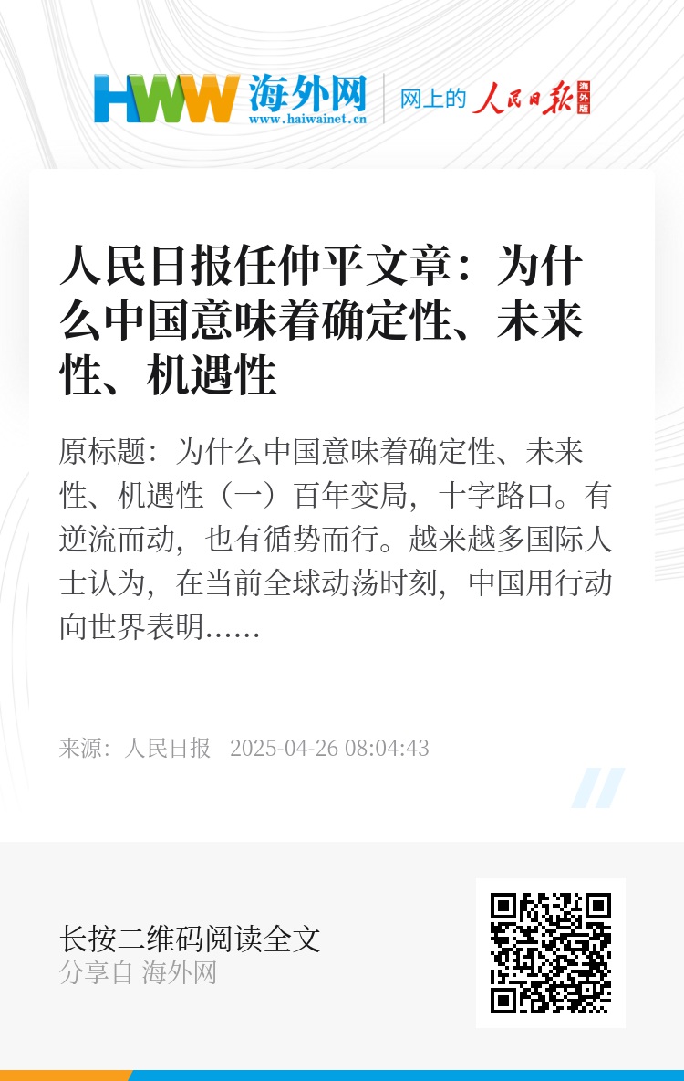越来越多国际人士认为,在当前全球动荡时刻,中国用行动向世界表明,中国是可以信赖并携手创造美好未来的伙伴,中国意味着确定性、未来性、机遇性。