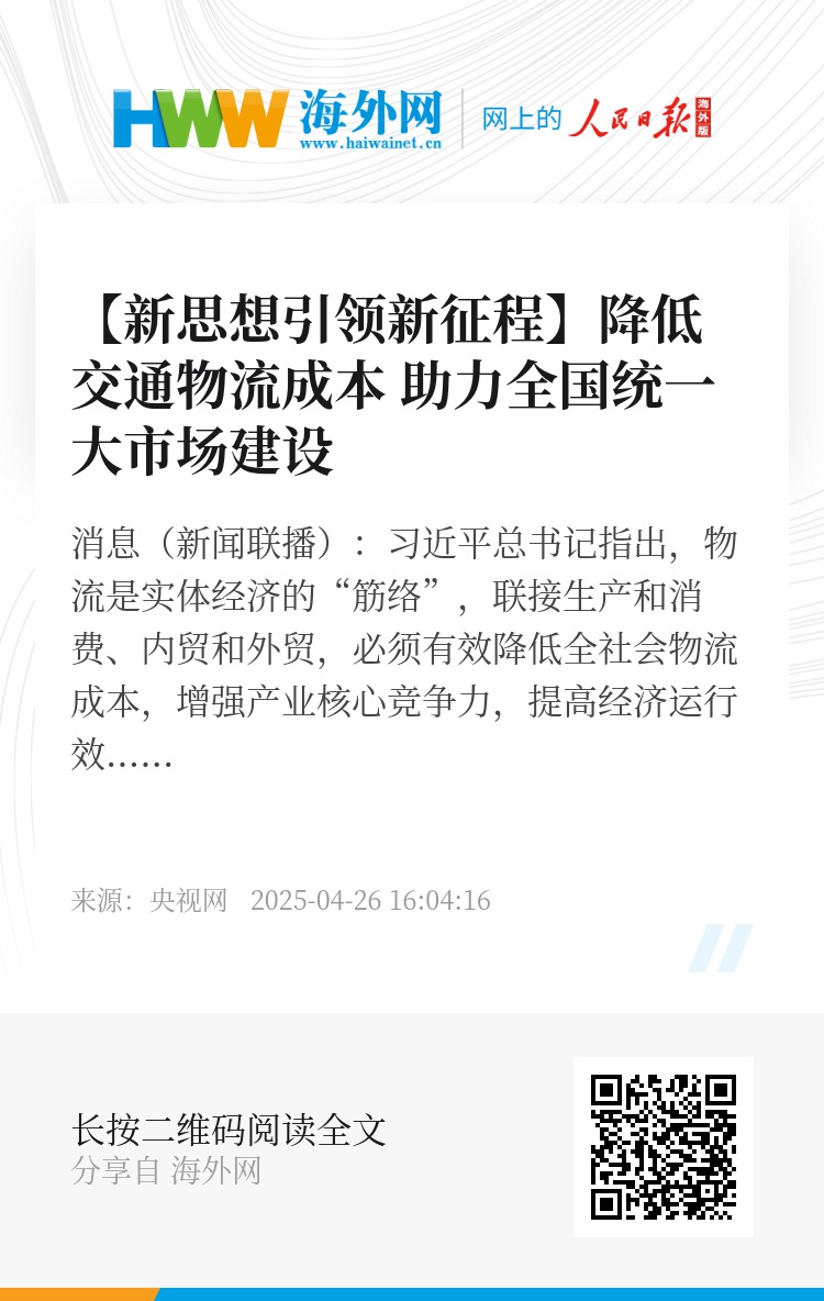 这是世界上最大的综合立体交通网,每天约有9万艘次船舶进出港、1.5万班次民航航班翱翔蓝天、3500万辆汽车穿行在高速公路、5亿件快递在神州大地穿梭流动。今年以来,我国货运数据屡创新高,物流成本持续下降,为中国经济高质量发展注入强劲动力。