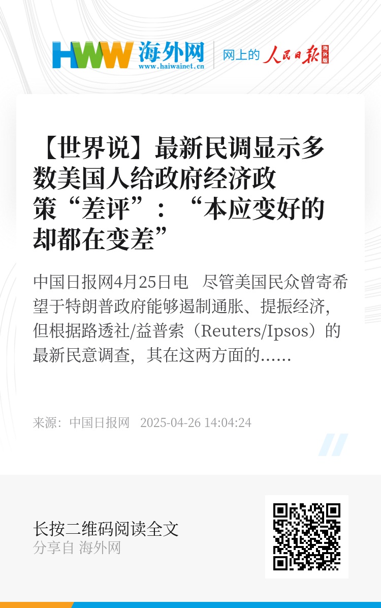 中国日报网4月25日电 尽管美国民众曾寄希望于特朗普政府能够遏制通胀、提振经济,但根据路透社/益普索(Reuters/Ipsos)的最新民意调查,其在这两方面的表现并未获得民众认可,多数人不仅给出差评,还担心经济衰退的到来。