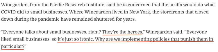 维恩加登就此发出灵魂拷问:“每个人都在谈论小企业,他们是英雄。大家都喜欢小企业,所以这太讽刺了。为什么我们要用关税惩罚它们?”