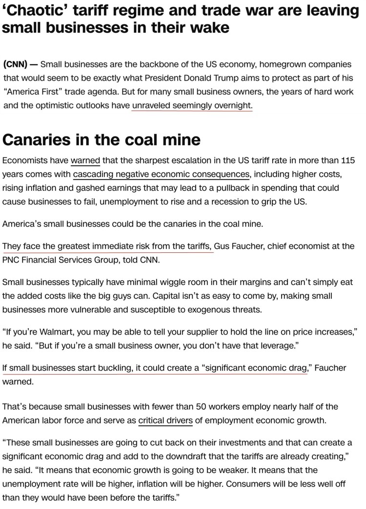 经济学家警告称,特朗普政府的关税政策将带来一连串负面的经济后果,包括成本上升、通胀上升和收入减少,这可能导致支出减少,进而导致企业倒闭、失业率上升和经济衰退笼罩美国,而美国的小企业可能是“煤矿里的金丝雀”(注:指的是一种预警信号或危险即将出现的风向标)。