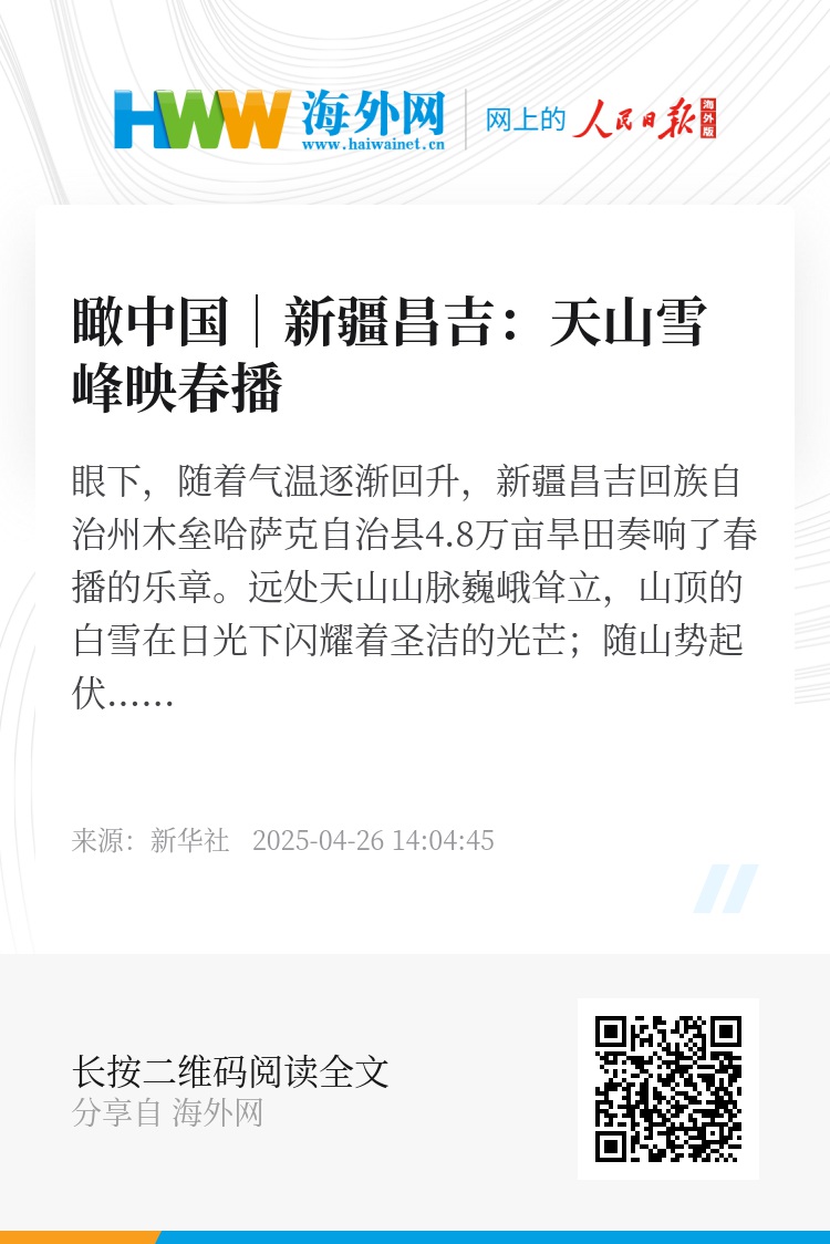 远处天山山脉巍峨耸立,山顶的白雪在日光下闪耀着圣洁的光芒;随山势起伏的旱地错落有致,播种机游走其间,蓬勃的生机正蓄势待发;田野里草色若有若无地浮现,浅浅的绿意点缀着棕褐色的大地……