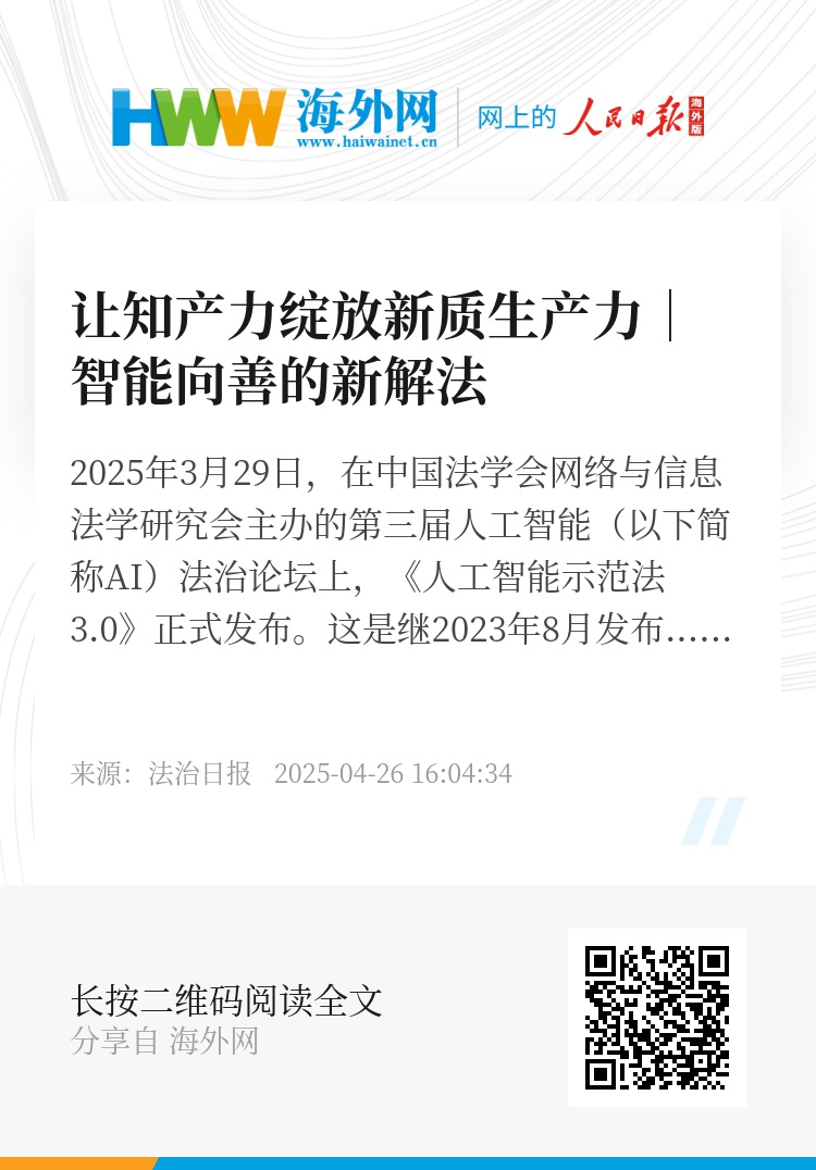 2025年3月29日,在中国法学会网络与信息法学研究会主办的第三届人工智能(以下简称AI)法治论坛上,《人工智能示范法3.0》正式发布。这是继2023年8月发布《人工智能示范法1.0》和2024年4月发布《人工智能示范法2.0》后的又一里程碑。作为国内首部系统性回应AI技术快速迭代的立法建议文本,该示范法始终保持着与技术创新、市场发展和全球治理趋势的同频共振,其最新版本创设了伦理治理嵌入技术全生命周期、政策动态评估与调整机制等新理念和新措施。