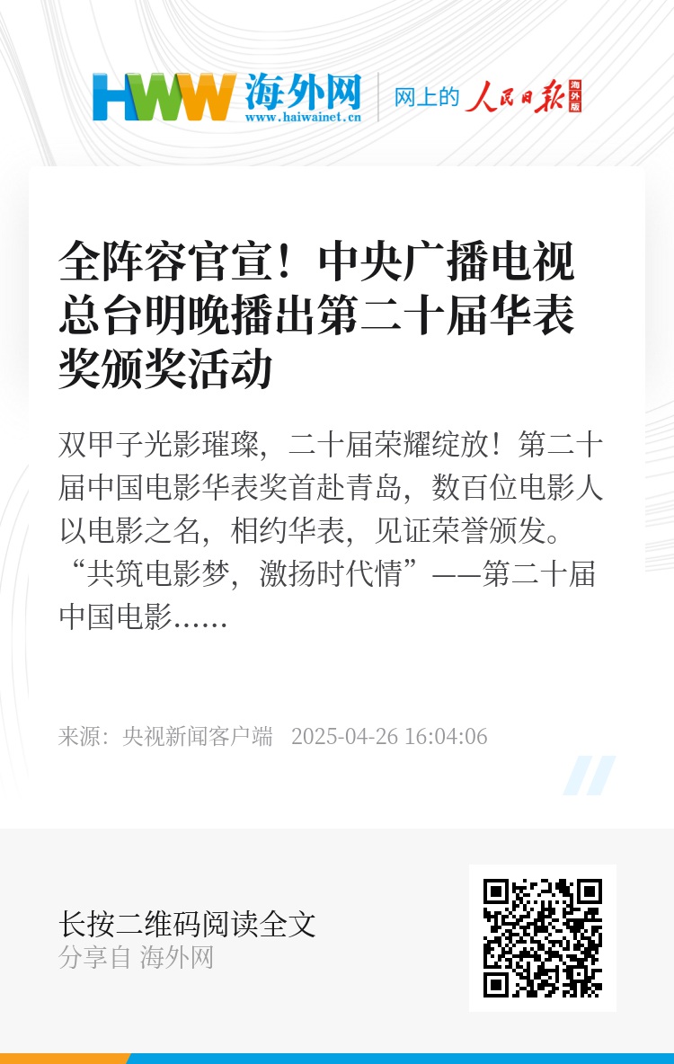 “共筑电影梦,激扬时代情”——第二十届中国电影华表奖颁奖活动将于4月27日晚黄金时段在CCTV-6电影频道、CCTV-4中文国际频道电视播出,中央广播电视总台新媒体矩阵、电影频道新媒体矩阵及全网平台同步网络播出。百廿光影路,华表再启航,4月27日锁定直播,共赏一场海风与星光交织的电影盛会!
