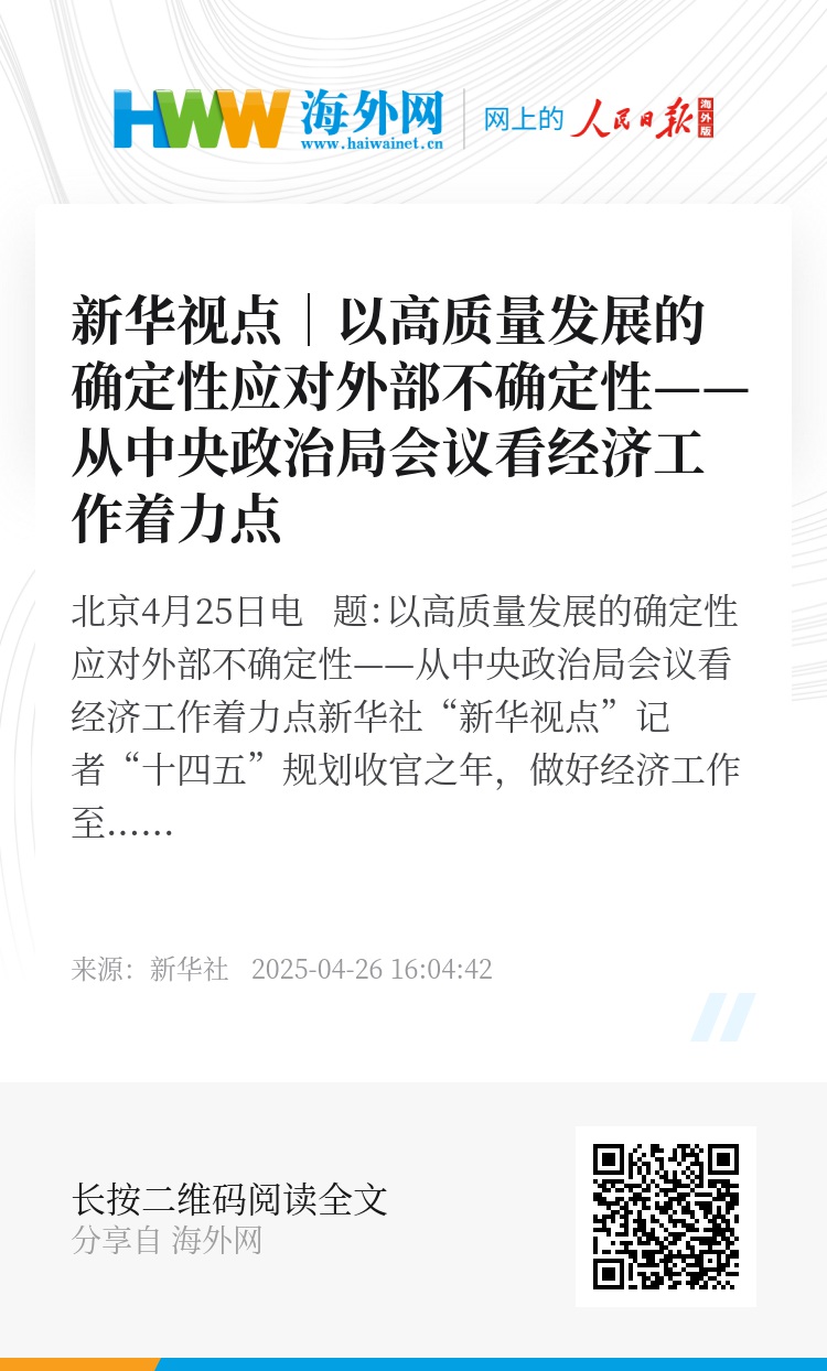 新华社北京4月25日电 题:以高质量发展的确定性应对外部不确定性——从中央政治局会议看经济工作着力点
