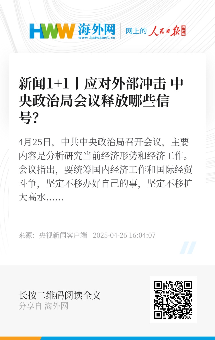 4月25日,中共中央政治局召开会议,主要内容是分析研究当前经济形势和经济工作。会议指出,要统筹国内经济工作和国际经贸斗争,坚定不移办好自己的事,坚定不移扩大高水平对外开放,着力稳就业、稳企业、稳市场、稳预期。应对美国关税战带来的外部冲击,此次会议的定调和部署格外重要。针对接下来的经济工作,会议在哪些方面进一步明确了方向和重点?如何进一步出台支持措施,并且保障措施的尽早落地?