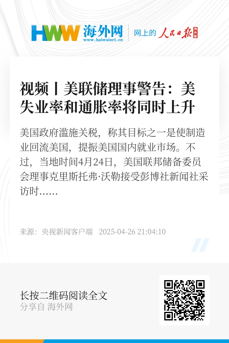 美国政府滥施关税,称其目标之一是使制造业回流美国,提振美国国内就业市场。不过,当地时间4月24日,美国联邦储备委员会理事克里斯托弗·沃勒接受彭博社新闻社采访时表示,他担心因美国政府的关税政策,美国的失业率和通胀率将同时上升。