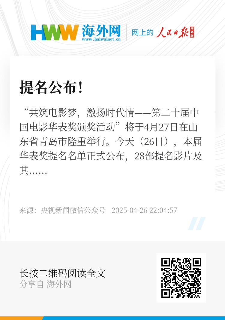 “共筑电影梦,激扬时代情——第二十届中国电影华表奖颁奖活动”将于4月27日在山东省青岛市隆重举行。今天(26日),本届华表奖提名名单正式公布,28部提名影片及其主创人员将冲击华表荣誉。