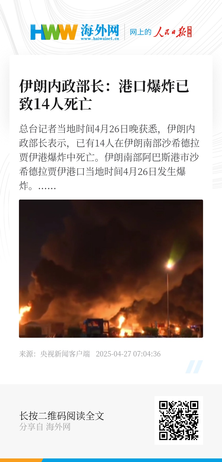 总台记者当地时间4月26日晚获悉,伊朗内政部长表示,已有14人在伊朗南部沙希德拉贾伊港爆炸中死亡。
