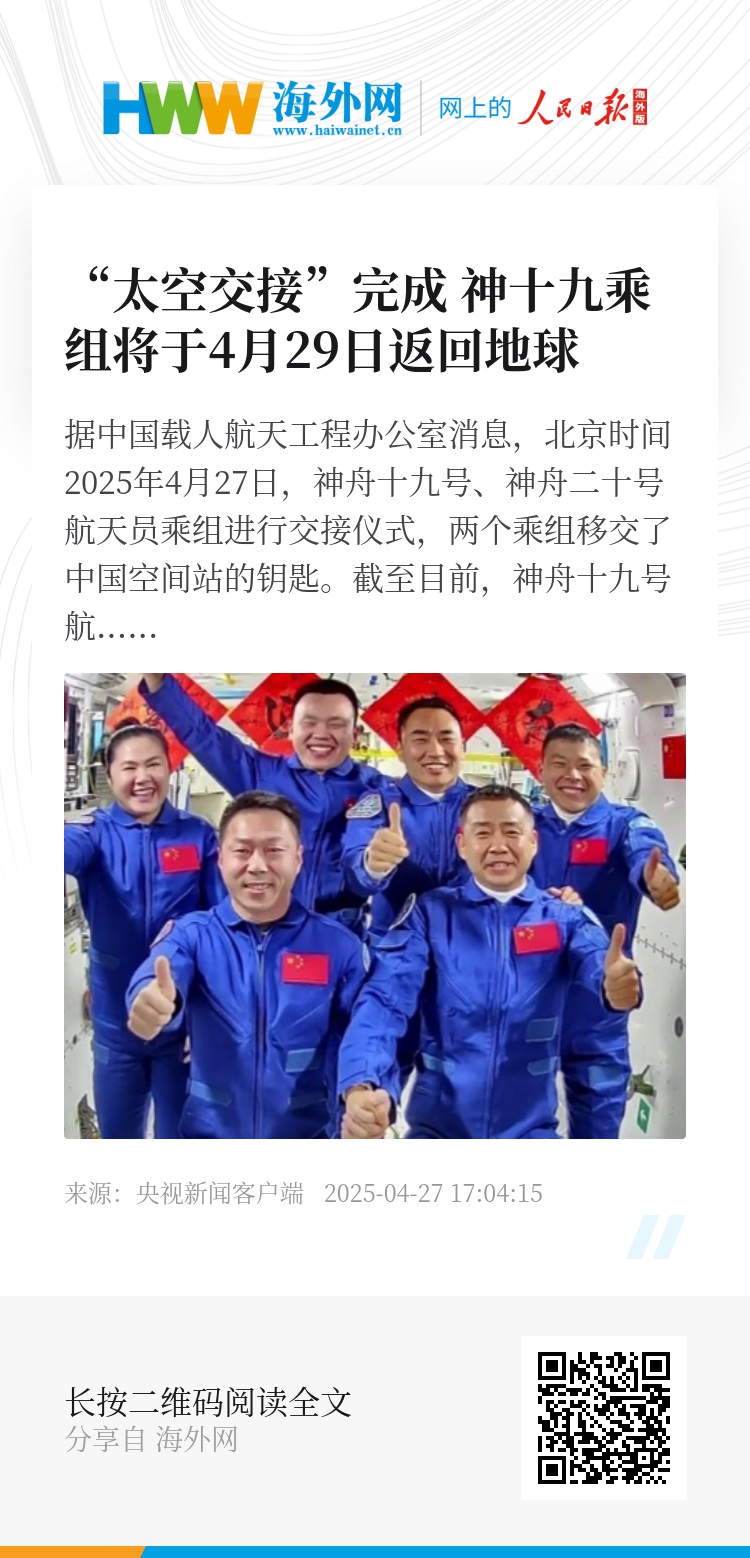 截至目前,神舟十九号航天员乘组已完成全部既定任务,将于4月29日乘坐神舟十九号载人飞船返回东风着陆场。