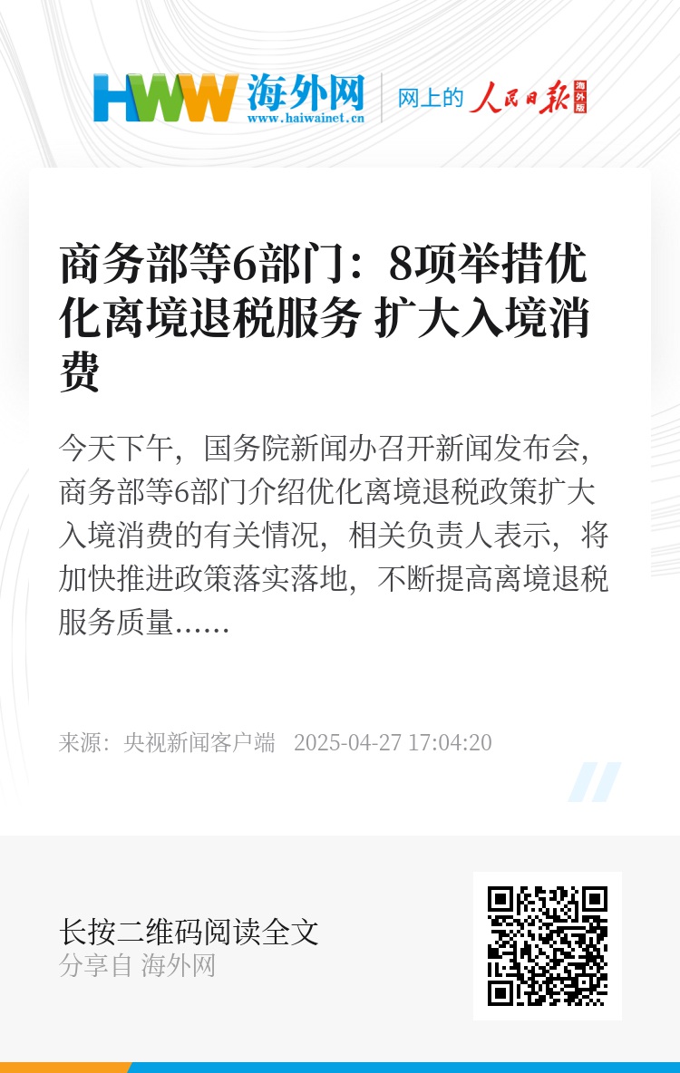 今天下午,国务院新闻办召开新闻发布会,商务部等6部门介绍优化离境退税政策扩大入境消费的有关情况,相关负责人表示,将加快推进政策落实落地,不断提高离境退税服务质量和水平,为提振消费注入新动力。
