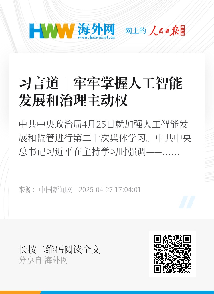 中共中央政治局4月25日就加强人工智能发展和监管进行第二十次集体学习。中共中央总书记习近平在主持学习时强调——