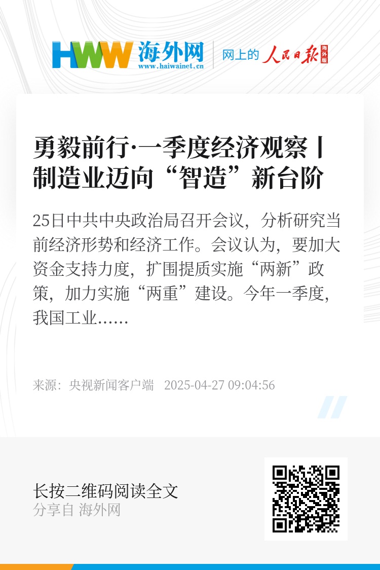 25日中共中央政治局召开会议,分析研究当前经济形势和经济工作。会议认为,要加大资金支持力度,扩围提质实施“两新”政策,加力实施“两重”建设。今年一季度,我国工业领域大规模设备更新加速落地,不仅拉动了投资增长、促进了产业发展,更在释放内需潜力、助力绿色转型等方面发挥了重要作用。
