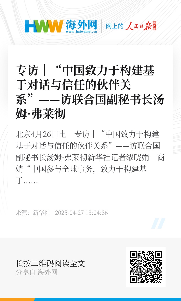 新华社北京4月26日电 专访|“中国致力于构建基于对话与信任的伙伴关系”——访联合国副秘书长汤姆·弗莱彻