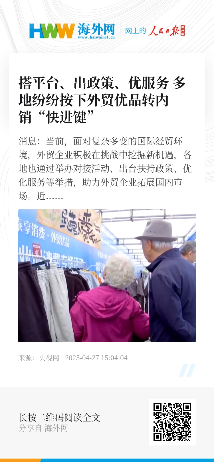 央视网消息:当前,面对复杂多变的国际经贸环境,外贸企业积极在挑战中挖掘新机遇,各地也通过举办对接活动、出台扶持政策、优化服务等举措,助力外贸企业拓展国内市场。