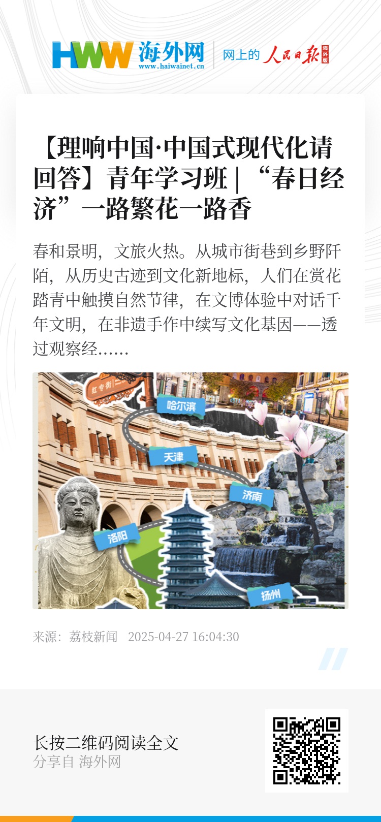 春和景明,文旅火热。从城市街巷到乡野阡陌,从历史古迹到文化新地标,人们在赏花踏青中触摸自然节律,在文博体验中对话千年文明,在非遗手作中续写文化基因——透过观察经济社会发展活力的窗口,在烟火人间的蓬勃图景中,我们看见“春日经济”与“假日经济”的活力热潮。