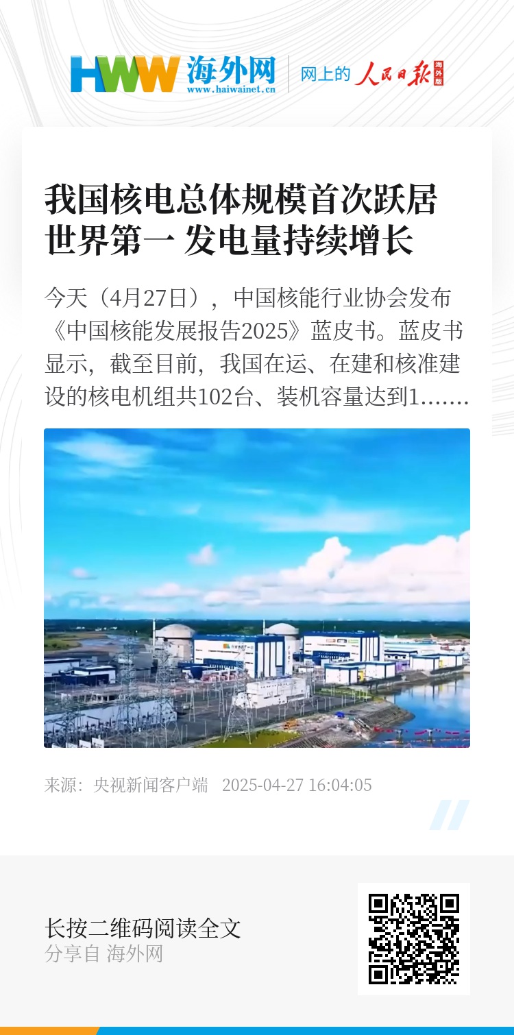 今天(4月27日),中国核能行业协会发布《中国核能发展报告2025》蓝皮书。蓝皮书显示,截至目前,我国在运、在建和核准建设的核电机组共102台、装机容量达到1.13亿千瓦,核电总体规模首次跃居世界第一。