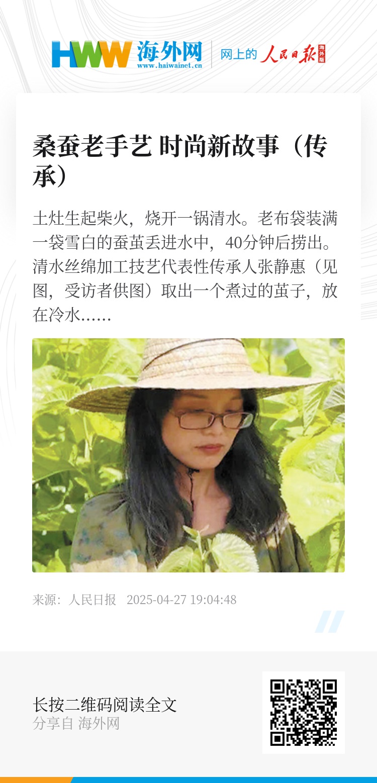 作为设计师,张静惠从民间收来的老一辈压箱底的老土布、粗绸布,设计成时髦的禅服、茶人服;把采桑养蚕、手工剥茧抽丝、老纺机纺丝织布、用当地非遗蓝印花布印染技艺印出图案,再做成服装,全过程呈现在网上。现在,张静惠在公众号、直播间的粉丝已有几十万。张静惠说,她和伙伴们努力的方向,就是让更多人看见江南老手艺,喜欢老手艺,让传承江南地区几千年的蚕桑文化更时尚、更有生命力,更好传承下去。(记者 顾 春)