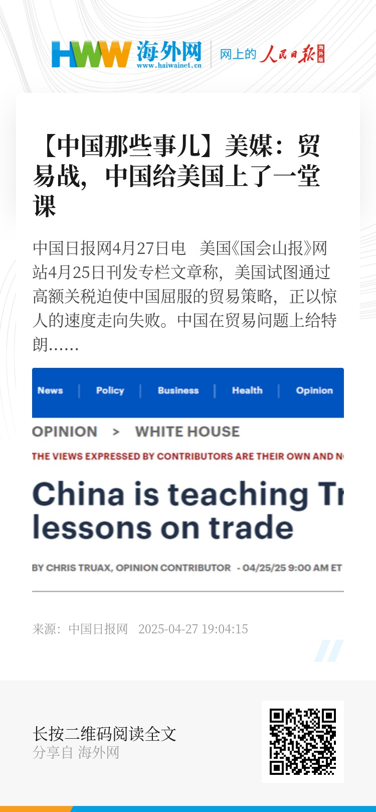 中国日报网4月27日电 美国《国会山报》网站4月25日刊发专栏文章称,美国试图通过高额关税迫使中国屈服的贸易策略,正以惊人的速度走向失败。中国在贸易问题上给特朗普上了严厉的一课。这场贸易战,不仅未能动摇中国,反而激发了中国新的国家使命感。