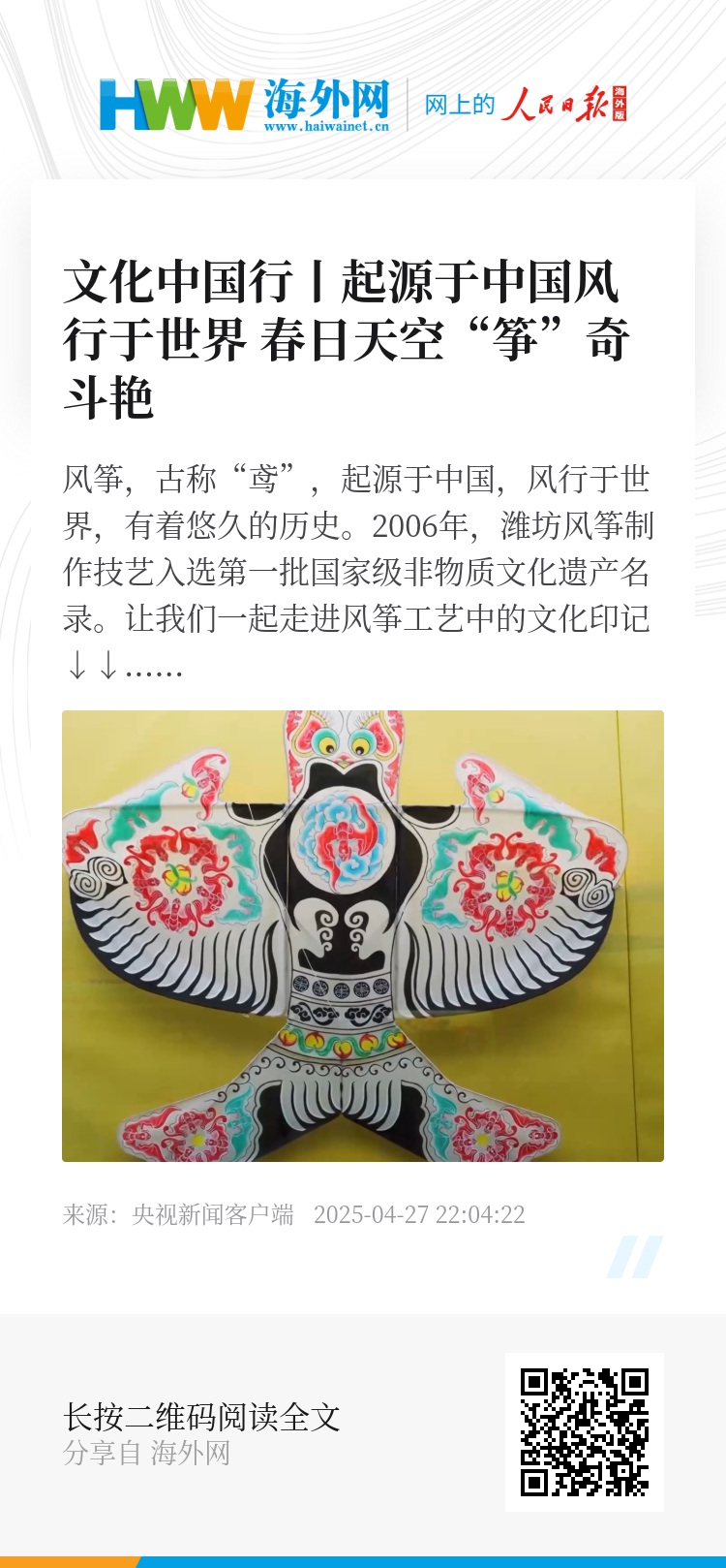风筝,古称“鸢”,起源于中国,风行于世界,有着悠久的历史。2006年,潍坊风筝制作技艺入选第一批国家级非物质文化遗产名录。让我们一起走进风筝工艺中的文化印记↓↓↓