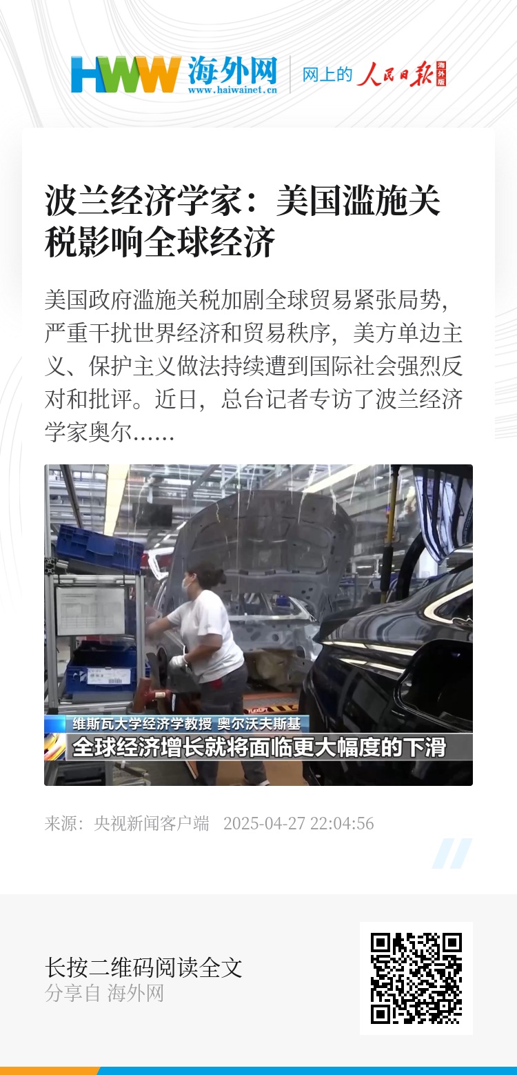 近日,总台记者专访了波兰经济学家奥尔沃夫斯基,他指出,美国滥施关税不仅给自身,也给全球经济带来消极影响。