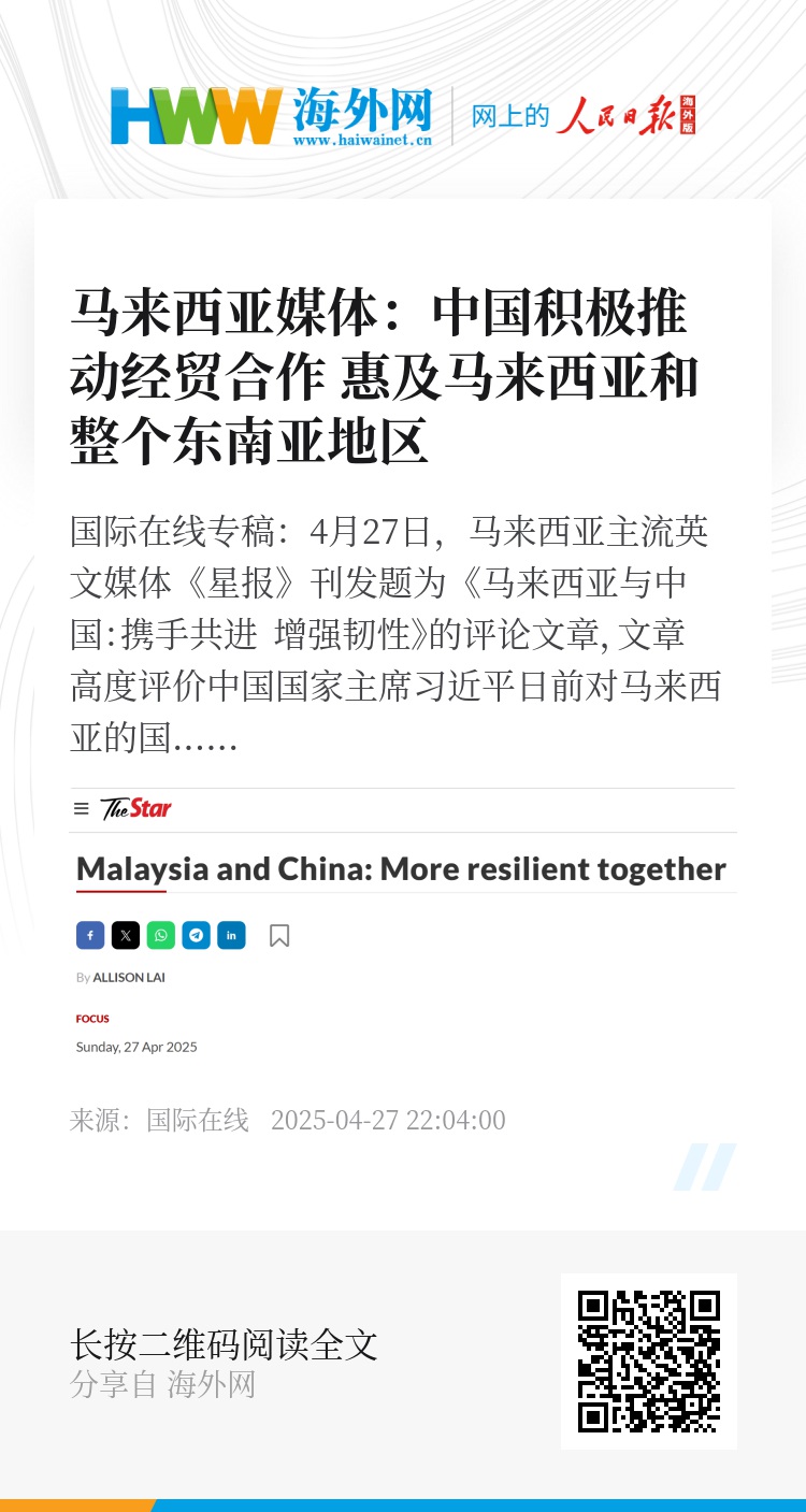 国际在线专稿:4月27日,马来西亚主流英文媒体《星报》刊发题为《马来西亚与中国:携手共进 增强韧性》的评论文章,文章高度评价中国国家主席习近平日前对马来西亚的国事访问成果,称赞马中两国不断深化双边关系与多领域合作的努力。文章指出,在美国滥施关税扰乱全球贸易秩序的当下,马中两国更应加强团结协作,共同应对挑战,中国积极参与经贸合作的立场和姿态正惠及整个东南亚地区。