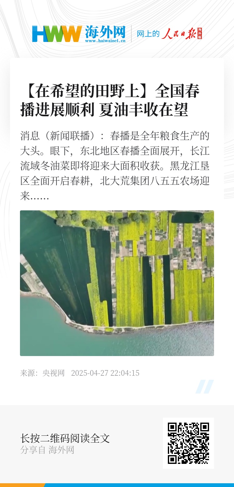 央视网消息(新闻联播):春播是全年粮食生产的大头。眼下,东北地区春播全面展开,长江流域冬油菜即将迎来大面积收获。