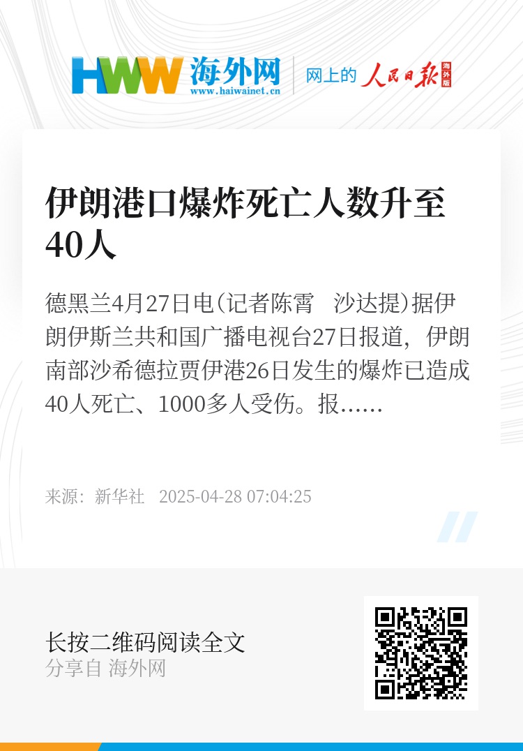 新华社德黑兰4月27日电(记者陈霄 沙达提)据伊朗伊斯兰共和国广播电视台27日报道,伊朗南部沙希德拉贾伊港26日发生的爆炸已造成40人死亡、1000多人受伤。