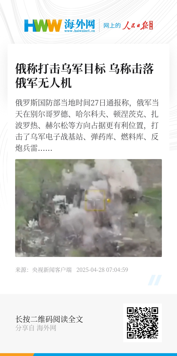 俄罗斯国防部当地时间27日通报称,俄军当天在别尔哥罗德、哈尔科夫、顿涅茨克、扎波罗热、赫尔松等方向占据更有利位置,打击了乌军电子战基站、弹药库、燃料库、反炮兵雷达等目标。俄防空部队则击落乌军100余架无人机,并拦截乌军航空制导炸弹、“海马斯”火箭弹和2枚改装后的S-200导弹。另据俄罗斯国防部当晚通报,俄军防空系统在克里米亚地区和黑海水域上空击落6架乌克兰无人机。