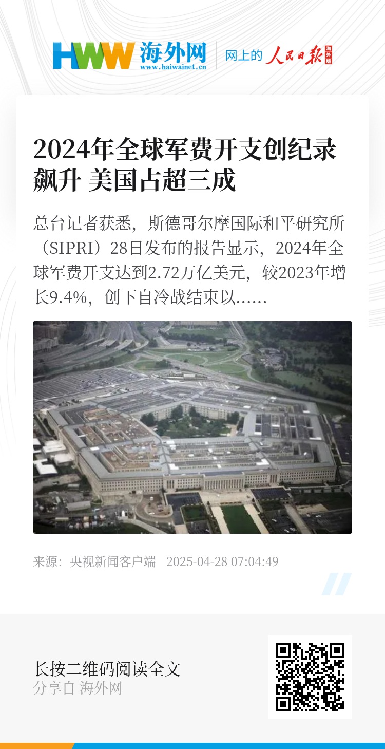总台记者获悉,斯德哥尔摩国际和平研究所(SIPRI)28日发布的报告显示,2024年全球军费开支达到2.72万亿美元,较2023年增长9.4%,创下自冷战结束以来的最大同比增幅。其中,美国军费开支增长5.7%,达到9970亿美元,占北约总军费开支的66%,占2024年世界军费开支的37%。此外,俄乌冲突以及对于美国针对北约承诺的质疑导致欧洲军费开支增长17%。(总台记者 张颖哲)