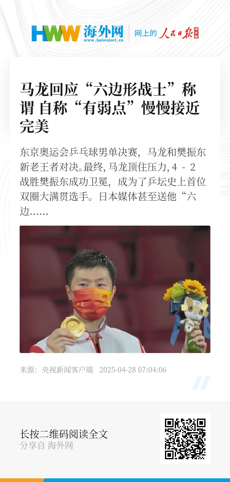 东京奥运会乒乓球男单决赛,马龙和樊振东新老王者对决。最终,马龙顶住压力,4 - 2 战胜樊振东成功卫冕,成为了乒坛史上首位双圈大满贯选手。日本媒体甚至送他“六边形战士”的称谓。近日,马龙在接受了总台《面对面》栏目的专访时,分享了自己对这一称谓的看法。
