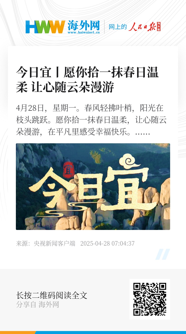 4月28日,星期一。春风轻拂叶梢,阳光在枝头跳跃。愿你拾一抹春日温柔,让心随云朵漫游,在平凡里感受幸福快乐。