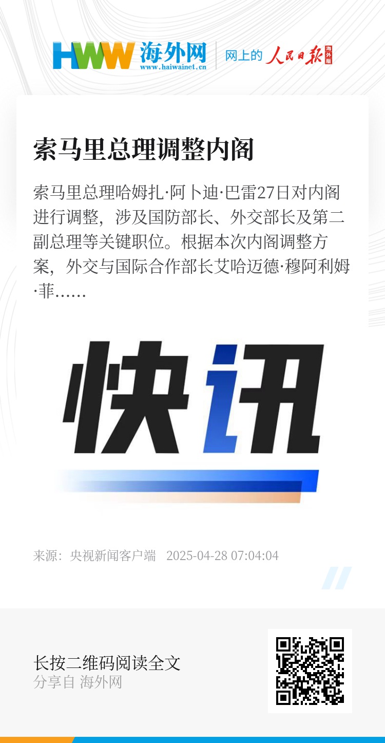索马里总理哈姆扎·阿卜迪·巴雷27日对内阁进行调整,涉及国防部长、外交部长及第二副总理等关键职位。