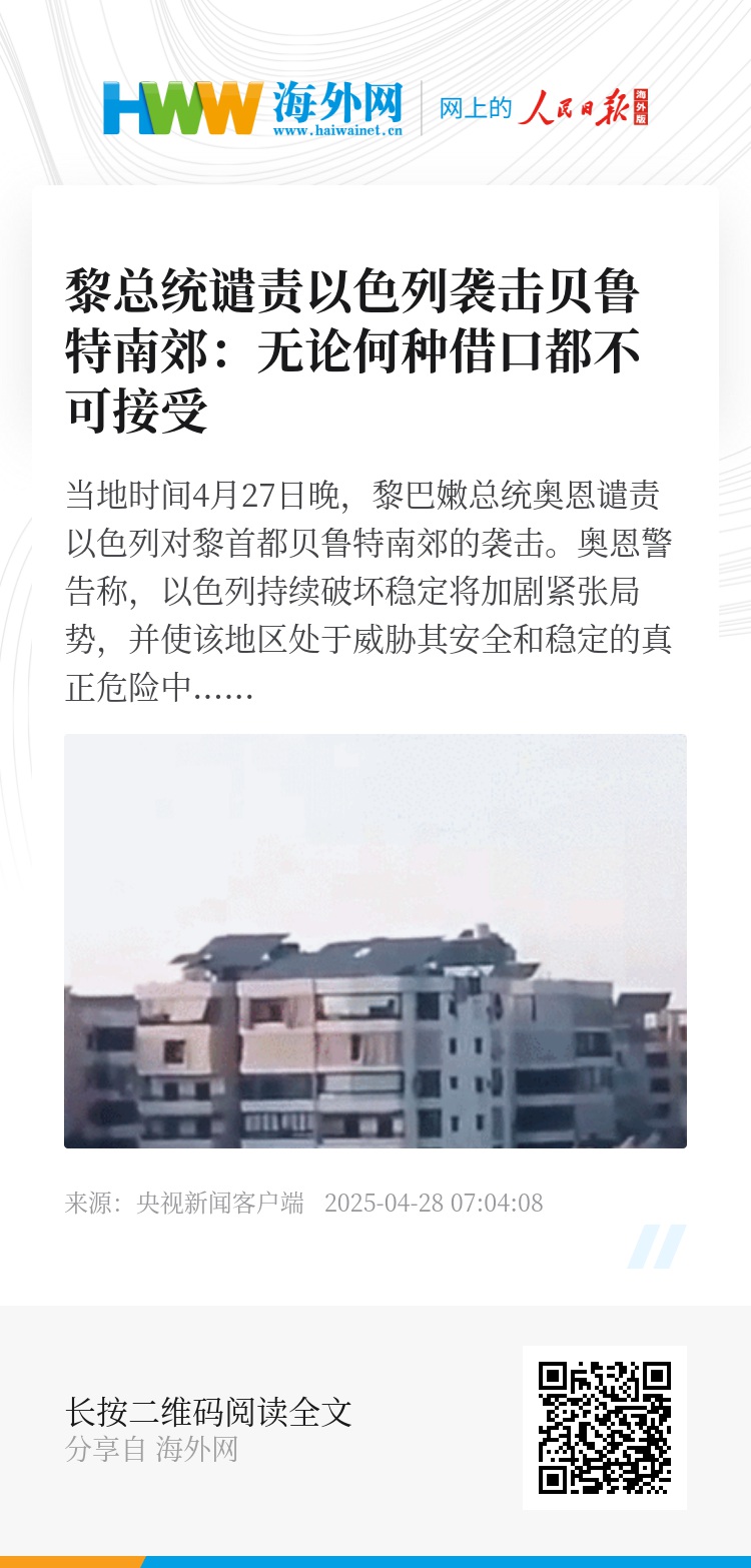 当地时间4月27日晚,黎巴嫩总统奥恩谴责以色列对黎首都贝鲁特南郊的袭击。