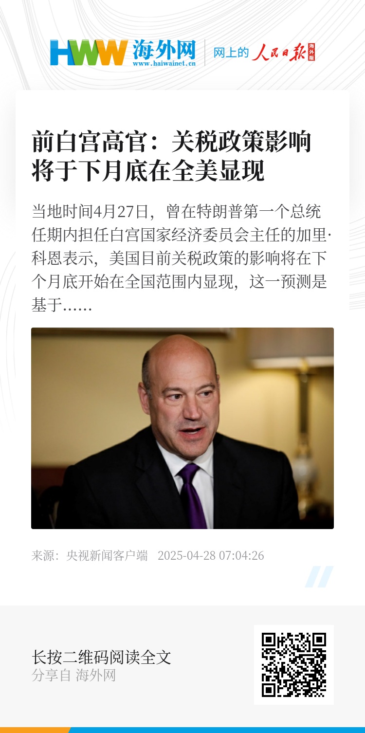 当地时间4月27日,曾在特朗普第一个总统任期内担任白宫国家经济委员会主任的加里·科恩表示,美国目前关税政策的影响将在下个月底开始在全国范围内显现,这一预测是基于货物运输和分发所需的时间。
