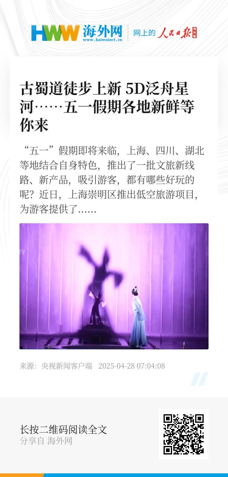 “五一”假期即将来临,上海、四川、湖北等地结合自身特色,推出了一批文旅新线路、新产品,吸引游客,都有哪些好玩的呢?