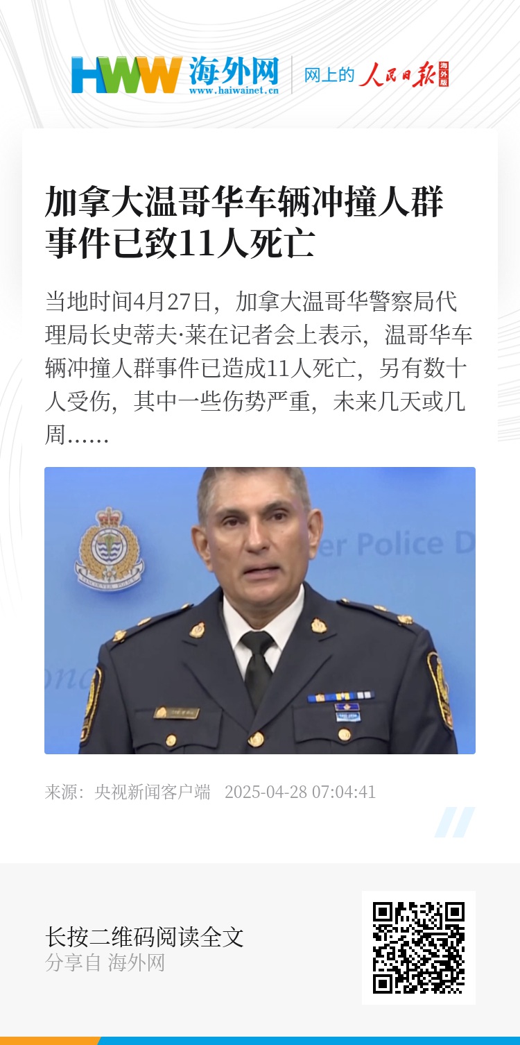 当地时间4月27日,加拿大温哥华警察局代理局长史蒂夫·莱在记者会上表示,温哥华车辆冲撞人群事件已造成11人死亡,另有数十人受伤,其中一些伤势严重,未来几天或几周内死亡人数可能还会上升。