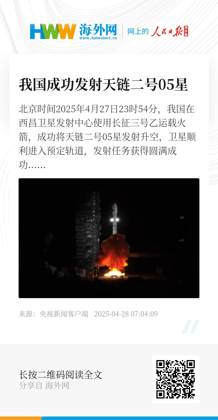 北京时间2025年4月27日23时54分,我国在西昌卫星发射中心使用长征三号乙运载火箭,成功将天链二号05星发射升空,卫星顺利进入预定轨道,发射任务获得圆满成功。该卫星是我国第二代地球同步轨道数据中继卫星,主要用于为飞船、空间站等载人航天器提供数据中继和测控服务,为中、低轨道资源卫星提供数据中继和测控服务,为航天器发射提供测控支持。
