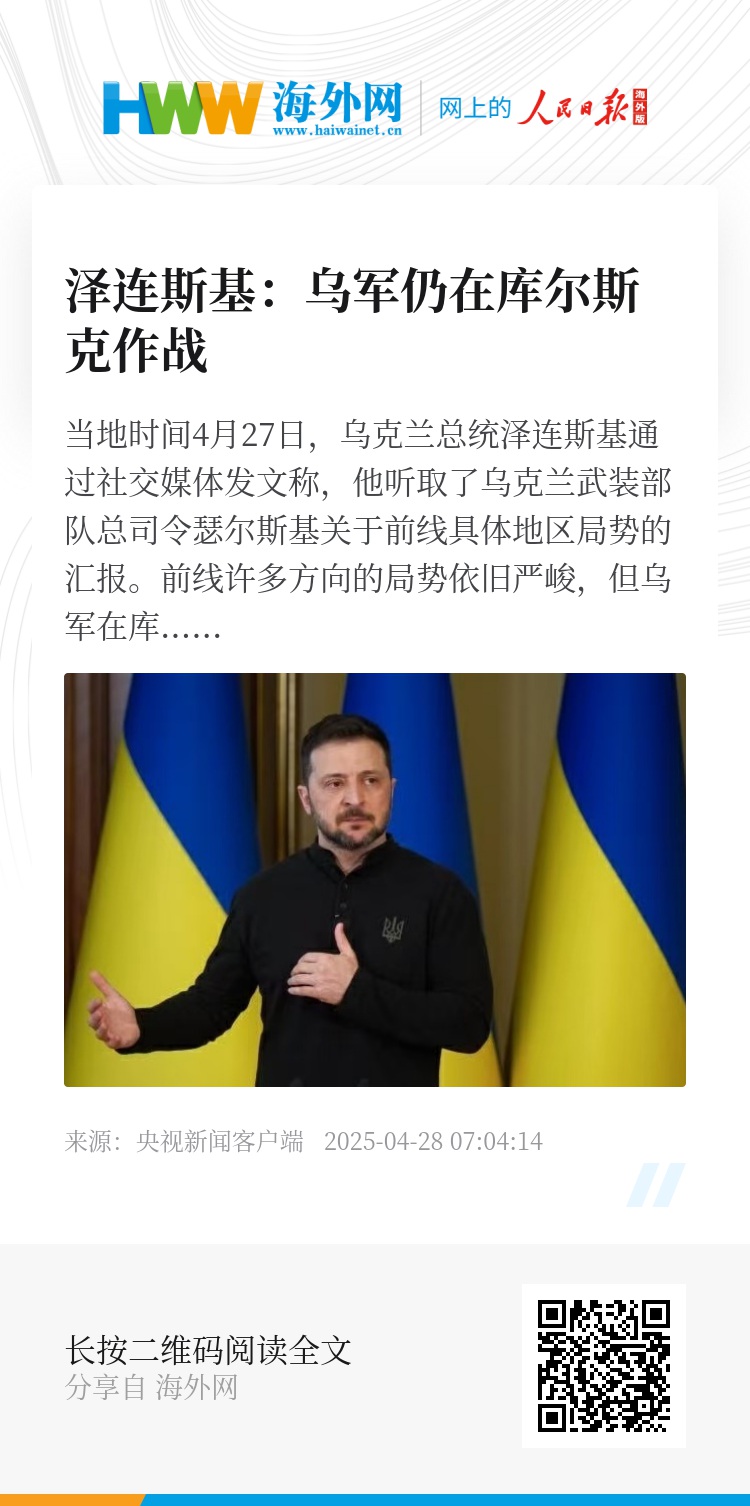 当地时间4月27日,乌克兰总统泽连斯基通过社交媒体发文称,他听取了乌克兰武装部队总司令瑟尔斯基关于前线具体地区局势的汇报。前线许多方向的局势依旧严峻,但乌军在库尔斯克和别尔哥罗德地区部分区域积极开展防御行动,抵抗俄军的进攻。