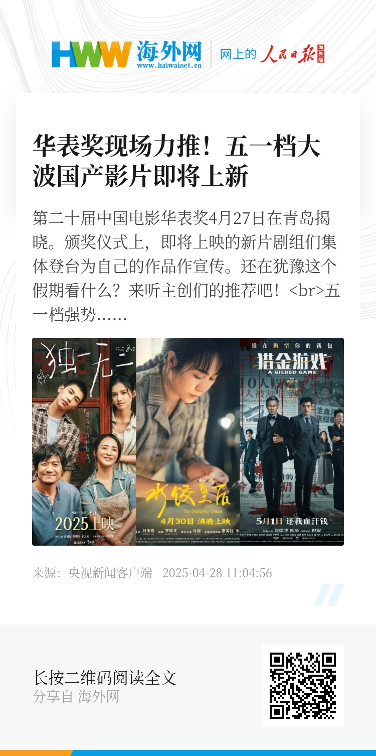 第二十届中国电影华表奖4月27日在青岛揭晓。颁奖仪式上,即将上映的新片剧组们集体登台为自己的作品作宣传。还在犹豫这个假期看什么?来听主创们的推荐吧!