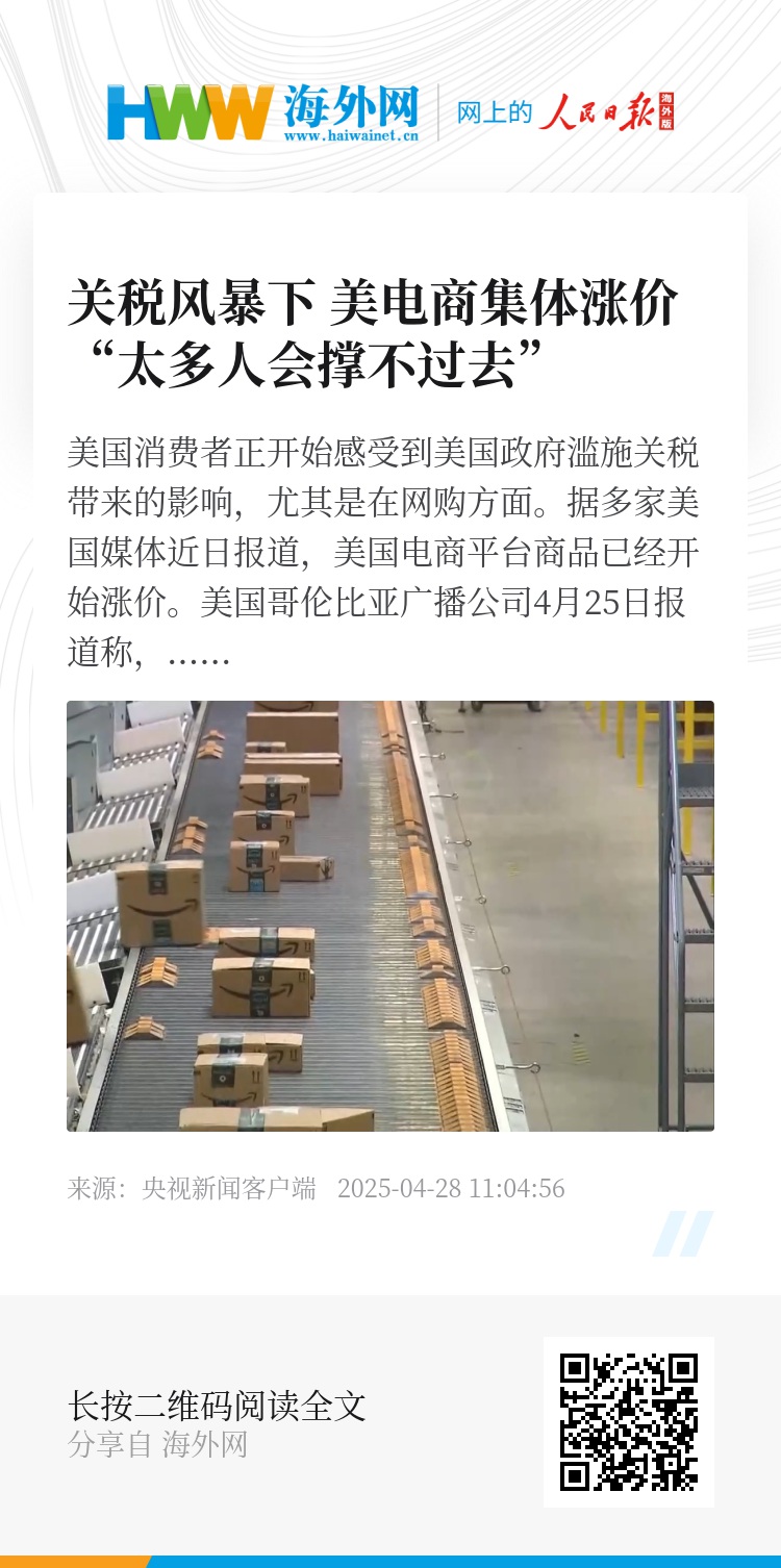 美国消费者正开始感受到美国政府滥施关税带来的影响,尤其是在网购方面。据多家美国媒体近日报道,美国电商平台商品已经开始涨价。