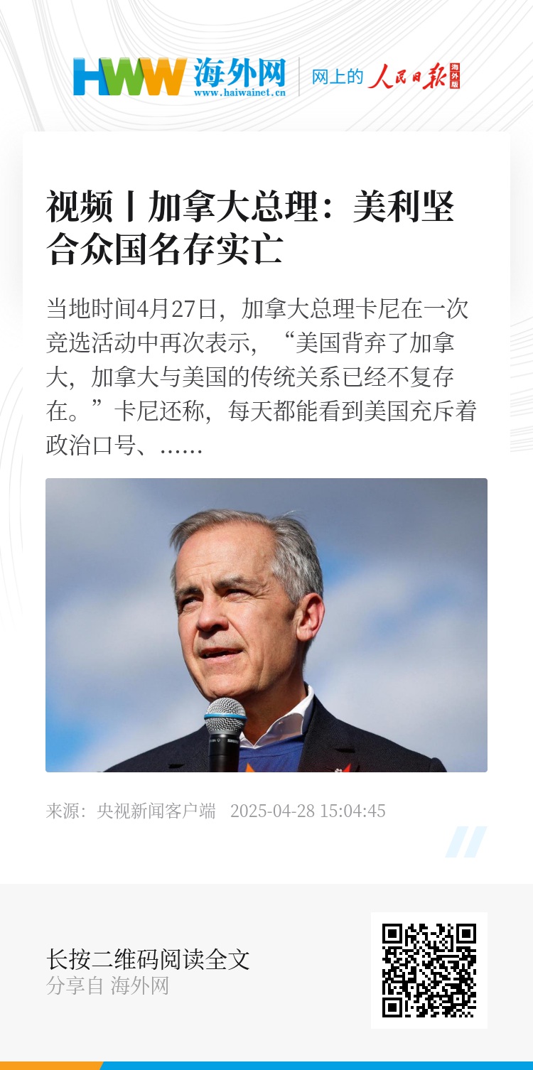 当地时间4月27日,加拿大总理卡尼在一次竞选活动中再次表示,“美国背弃了加拿大,加拿大与美国的传统关系已经不复存在。”
