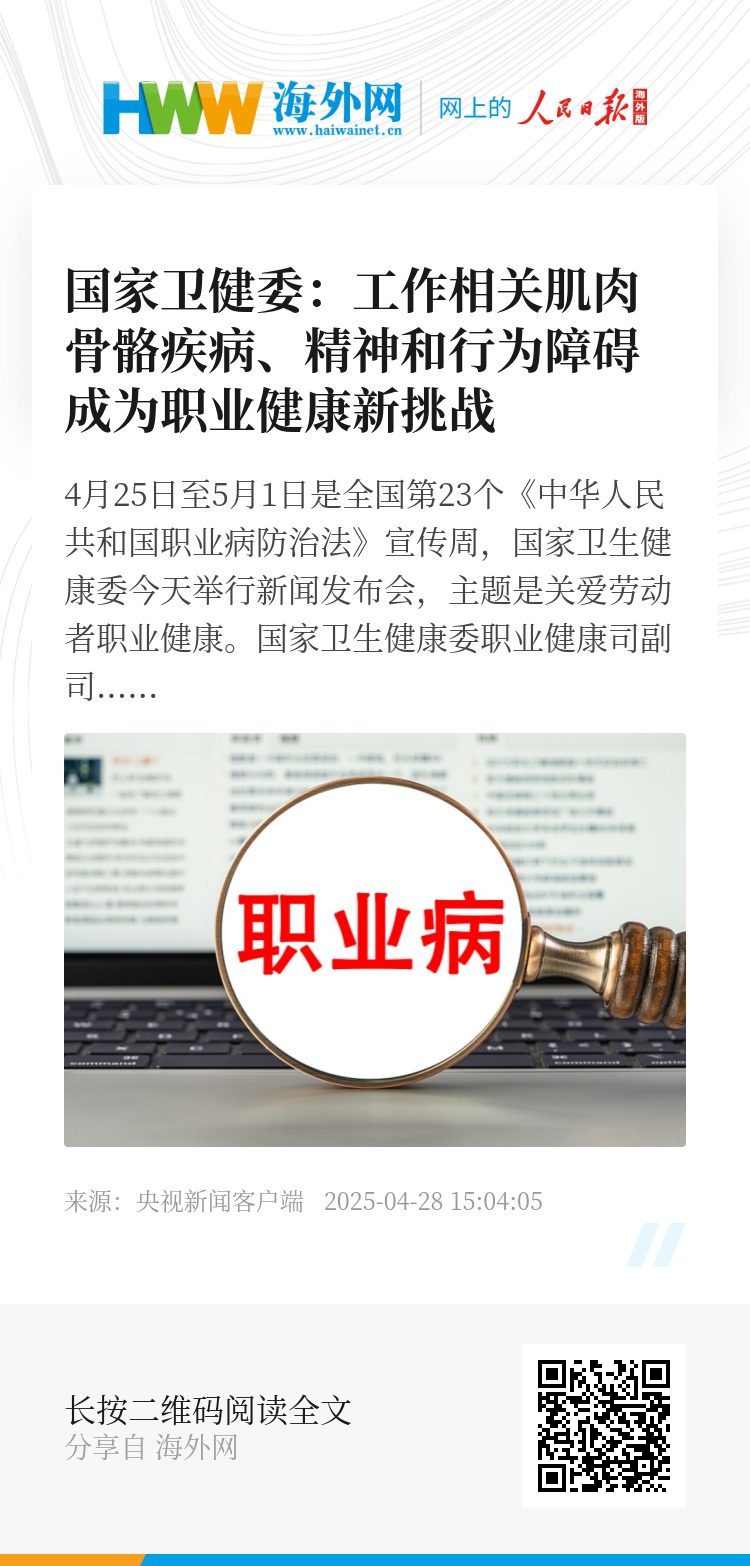 监测数据显示,工作相关的肌肉骨骼疾病、精神和行为障碍等职业健康问题已成为当前面对的新挑战。在广泛调研的基础上,基于几方面的考虑,一是突出重点病种、二是要与我国现阶段经济社会发展水平相适应、三是要保持目录的连续性与可操作性,按照循序渐进、稳步推进的原则,去年12月份国家卫生健康委会同有关部门调整了职业病目录,新增职业性肌肉骨骼疾病、职业性精神和行为障碍2个职业病类别,与国际劳工组织及世界上多数国家保持一致。调整后,我国法定职业病有12类135种,新版《职业病分类和目录》将于今年8月1日起正式实施。