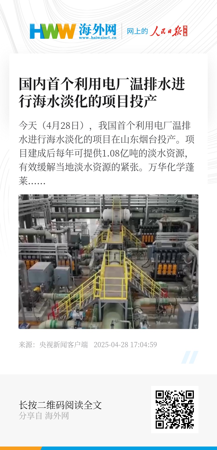 今天(4月28日),我国首个利用电厂温排水进行海水淡化的项目在山东烟台投产。项目建成后每年可提供1.08亿吨的淡水资源,有效缓解当地淡水资源的紧张。