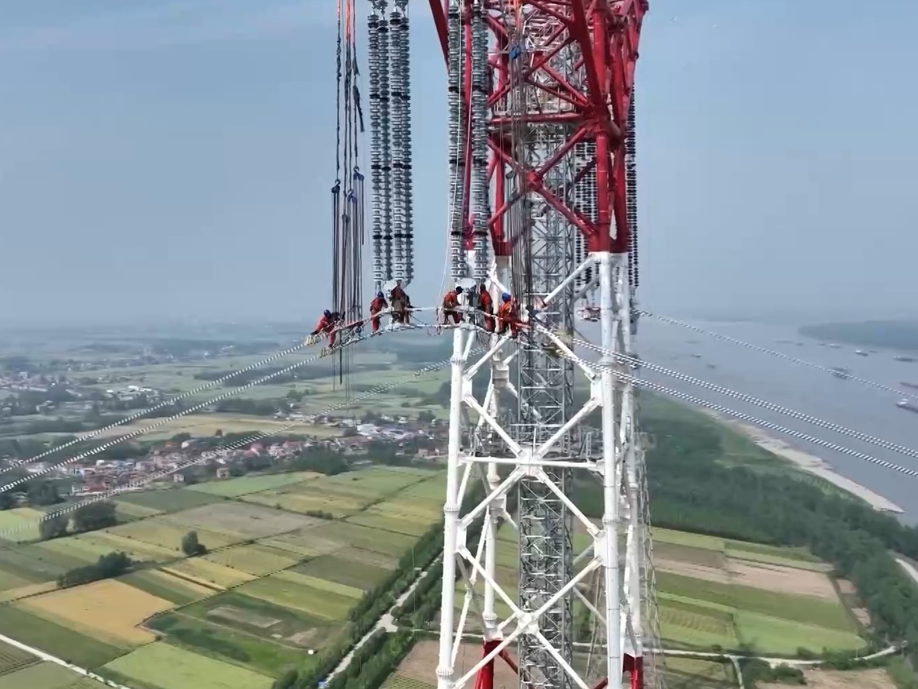 此次跨越工程北岸起自湖北洪湖市龙口镇,南岸止于湖北嘉鱼县鱼岳镇。施工人员将8根导线和2根地线从北岸的铁塔牵引到南岸的铁塔,两座铁塔高229.2米,相当于70层楼高,两岸跨距达到1800米。为最大限度减少施工对长江航运的影响,施工单位创新施工方法,提高施工效率,使用载重3000吨的牵引船牵引导线,实现两岸铁塔成功“牵手”。