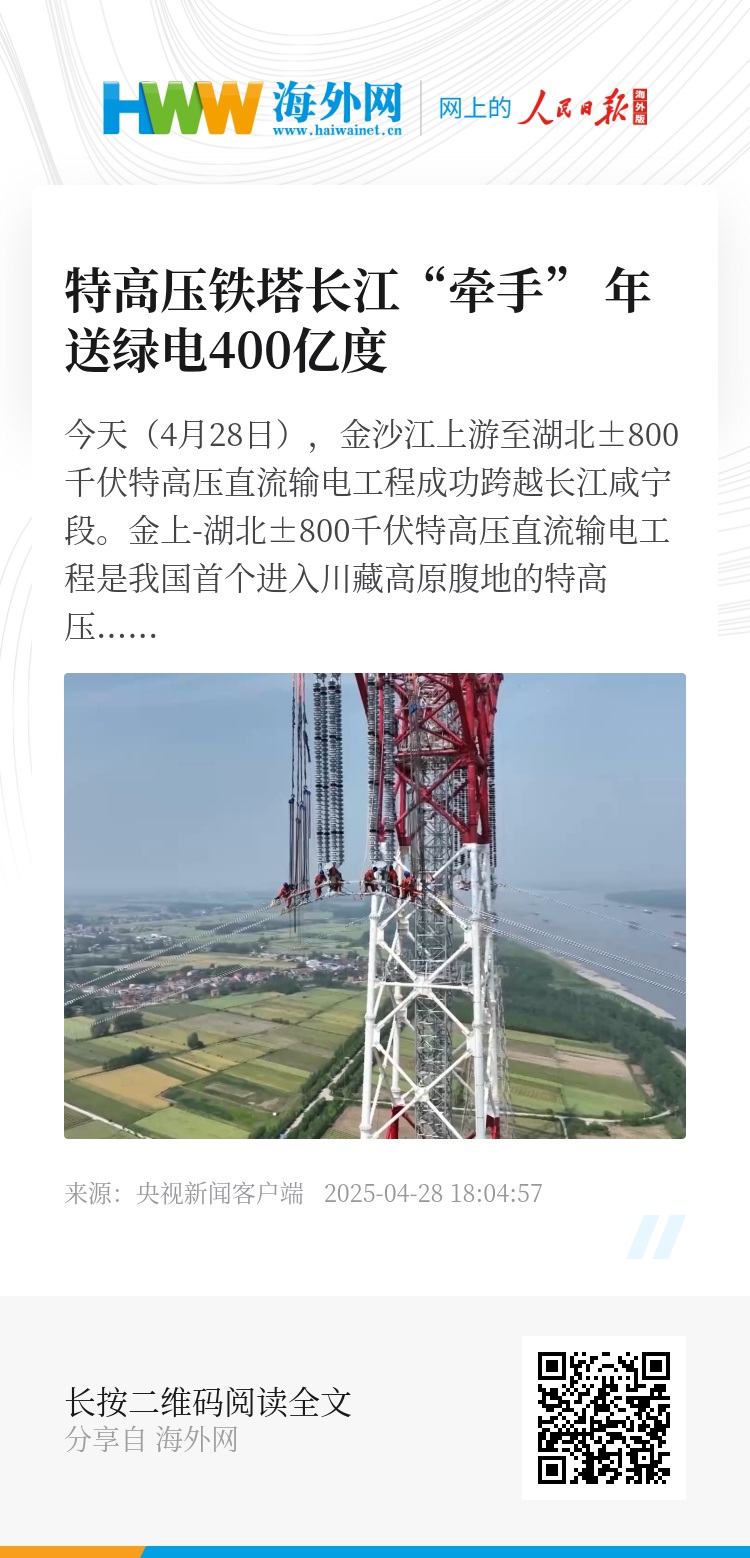 今天(4月28日),金沙江上游至湖北±800千伏特高压直流输电工程成功跨越长江咸宁段。