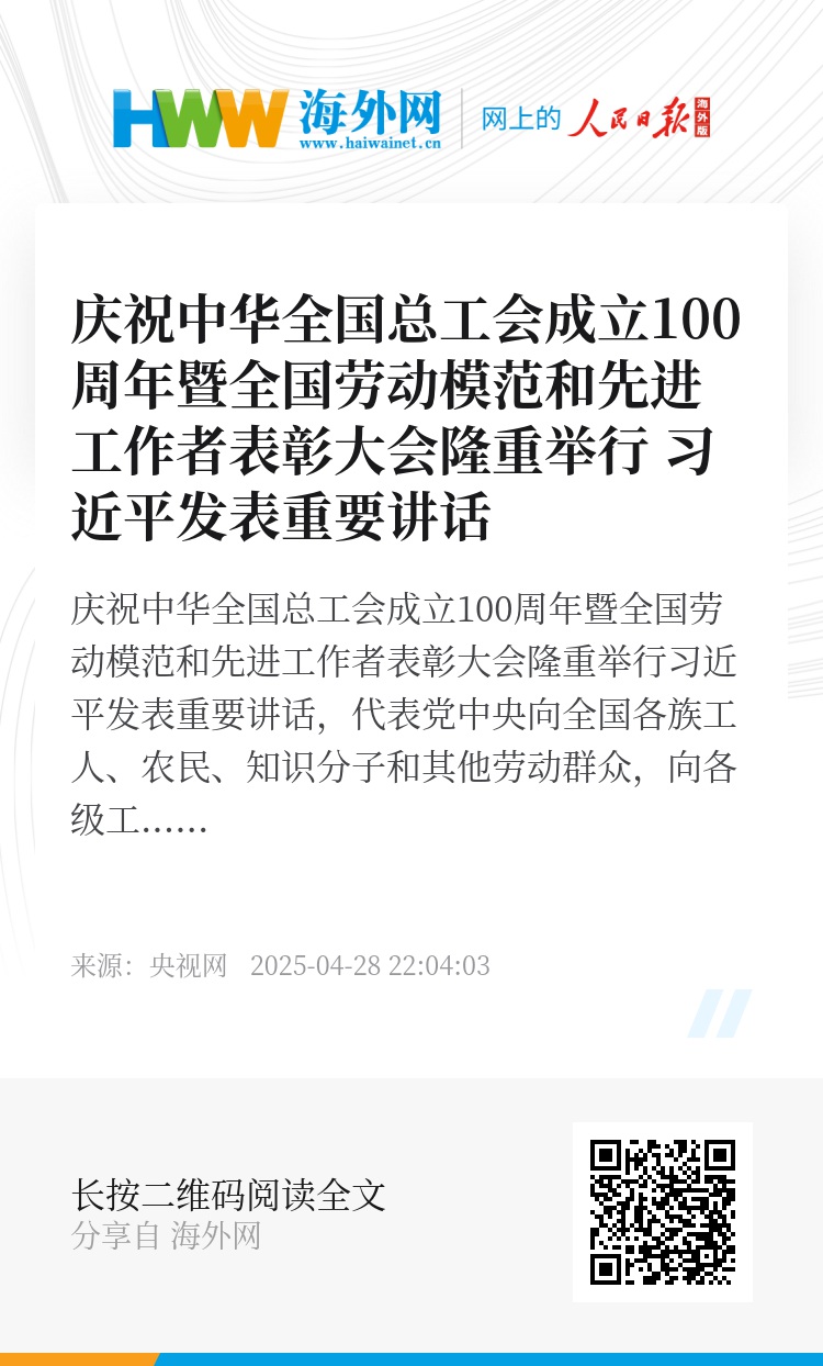 习近平发表重要讲话,代表党中央向全国各族工人、农民、知识分子和其他劳动群众,向各级工会组织和全体工会工作者致以诚挚问候!向受到表彰的全国劳动模范和先进工作者表示热烈祝贺!