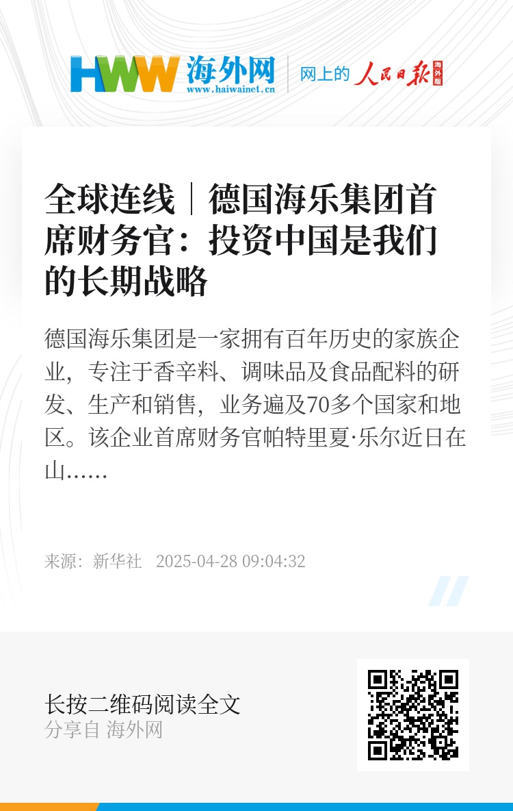 德国海乐集团是一家拥有百年历史的家族企业,专注于香辛料、调味品及食品配料的研发、生产和销售,业务遍及70多个国家和地区。该企业首席财务官帕特里夏·乐尔近日在山东济南接受新华社专访时表示,海乐集团的中国之路正在不断拓展,企业将持续扎根中国,共享发展机遇。