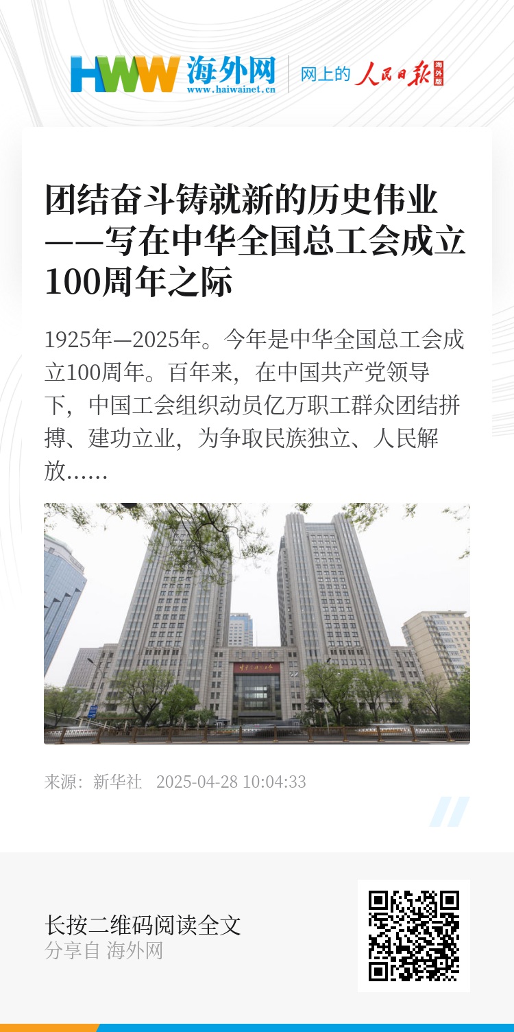 今年是中华全国总工会成立100周年。百年来,在中国共产党领导下,中国工会组织动员亿万职工群众团结拼搏、建功立业,为争取民族独立、人民解放和实现国家富强、人民幸福贡献智慧和力量。